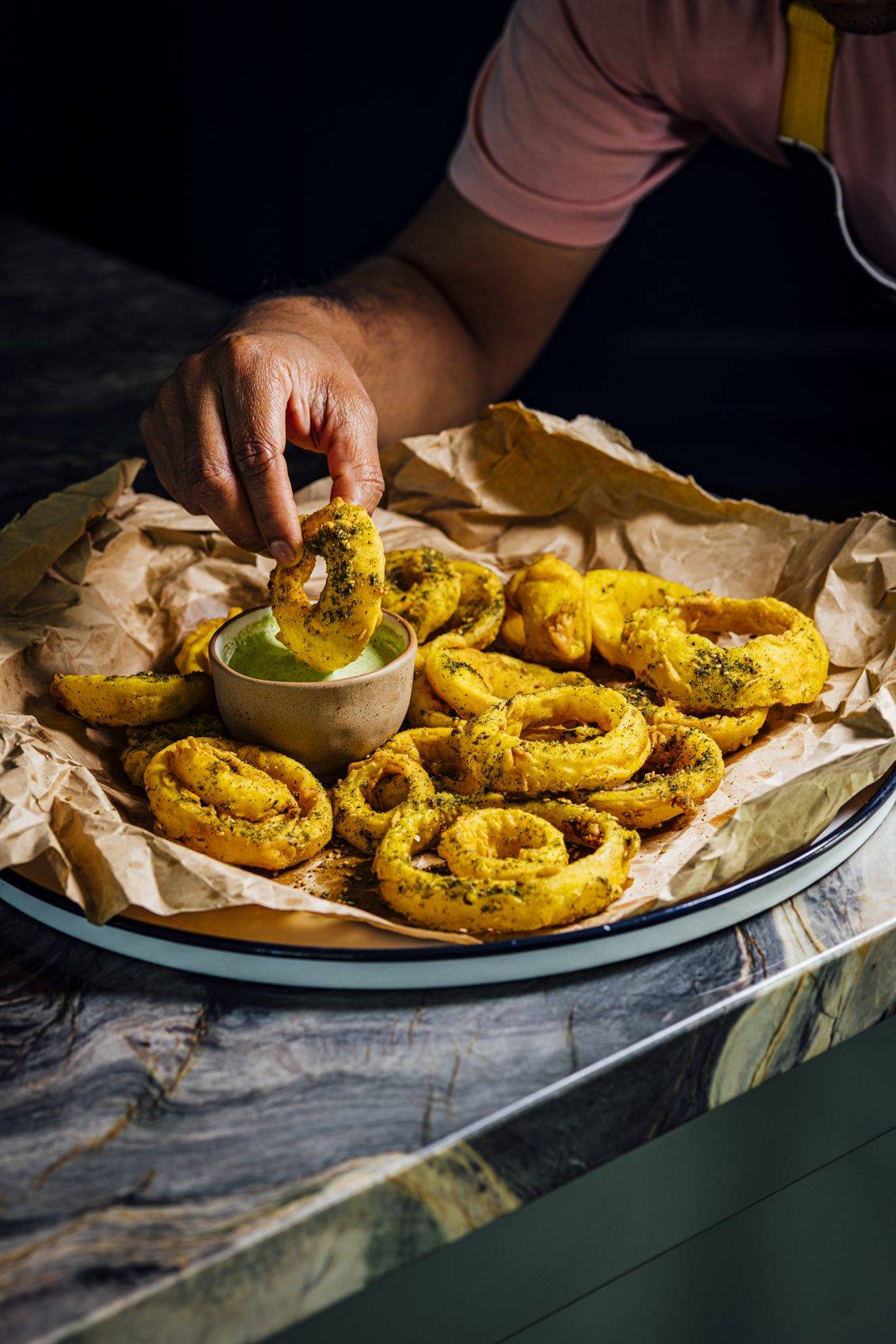 ZA’ATAR ONION RINGS WITH BUTTERMILK CARAWAY DIPPING SAUCE